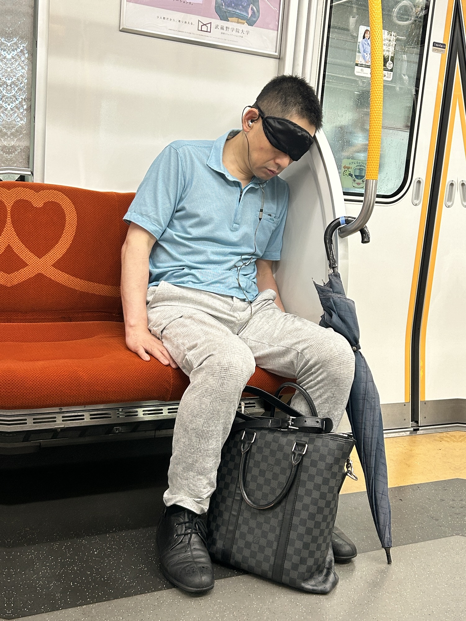 プライオリティシートに座るおじさん!乗車していきなりアイマスクして、イヤフォン(プレーヤーには繋がっていない! 今日は雨なので靴は履いているけれどいつもは脱いで、絶対席は譲らないという気構えで座っている。実は私も毎日プライオリティシート常習...